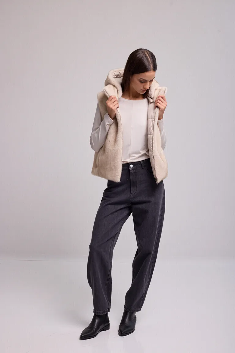 Chaleco con diseño reversible que permite alternar entre textura de piel y efecto puffer. Presenta cierre frontal, bolsillos laterales y capucha incorporada. Una prenda funcional para completar conjuntos diarios aportando versatilidad y abrigo en capas.