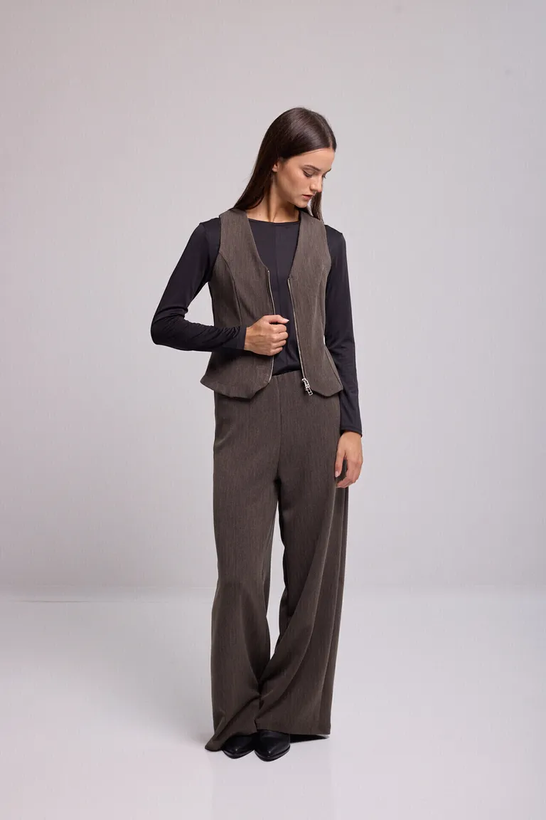 Chaleco de corte sastrero diseñado con una silueta ajustada al cuerpo, resaltada por pinzas tanto en el frente como en la parte posterior. Presenta un diseño versátil con cierre metálico de doble carril, ideal para combinar en diversos outfits. Esta pieza destaca por sus líneas clásicas y su calce entallado, aportando sofisticación y estructura al estilo diario.