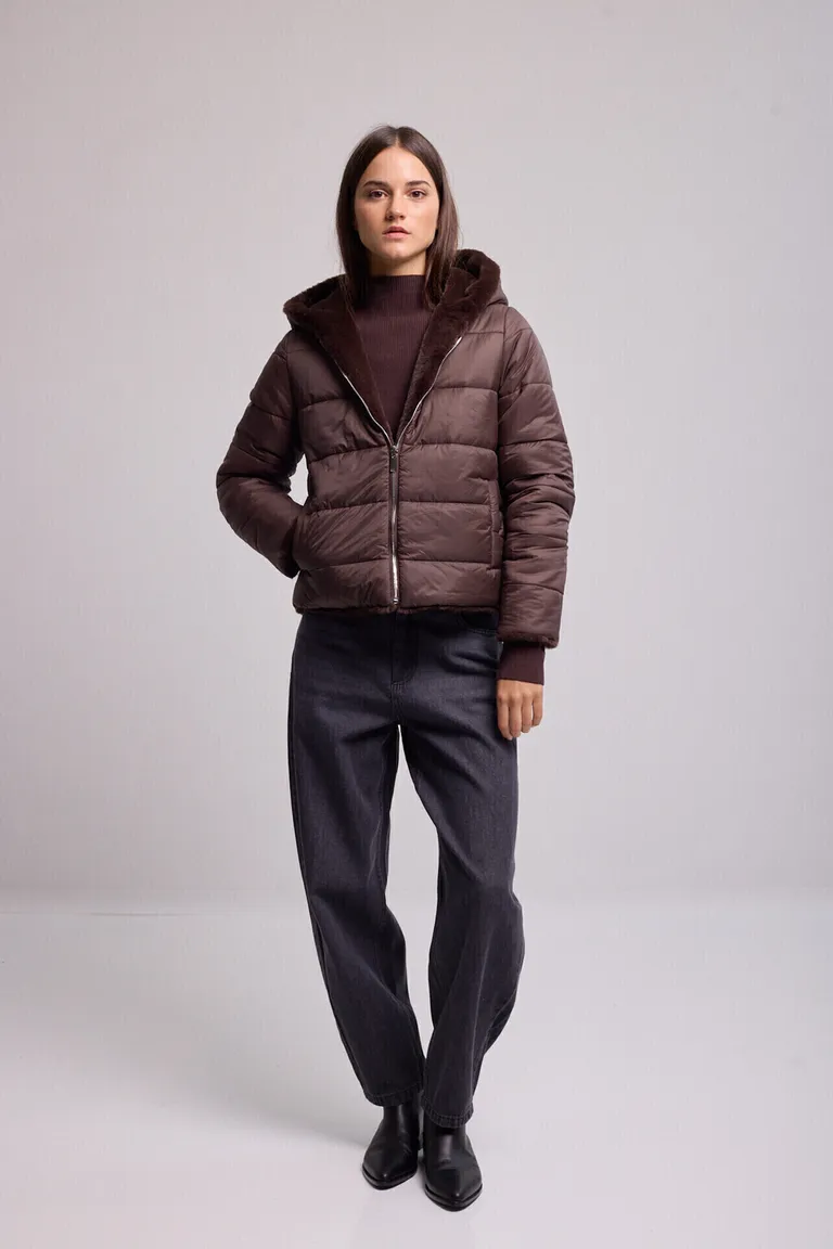 Chaqueta reversible con diseño versátil. Presenta un lado con efecto piel y otro estilo puffer, ideal para completar tus outfits de invierno. Cuenta con cierre frontal con cremallera y capucha también reversible, brindando comodidad y abrigo en una sola prenda de líneas simples y funcionales.