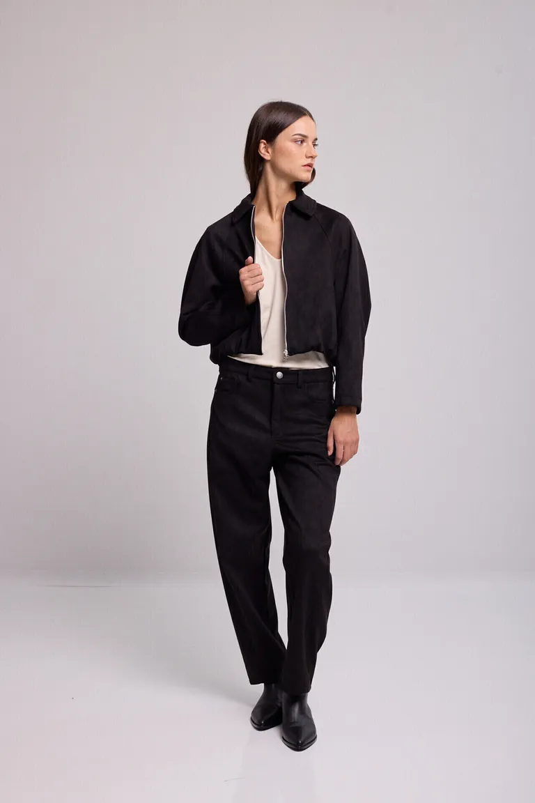 Chaqueta tipo bomber con cierre frontal y ajuste elástico en la cintura que genera un efecto balloon. Presenta recortes frontales con bolsillos integrados, ofreciendo un diseño funcional y moderno ideal para completar outfits urbanos.