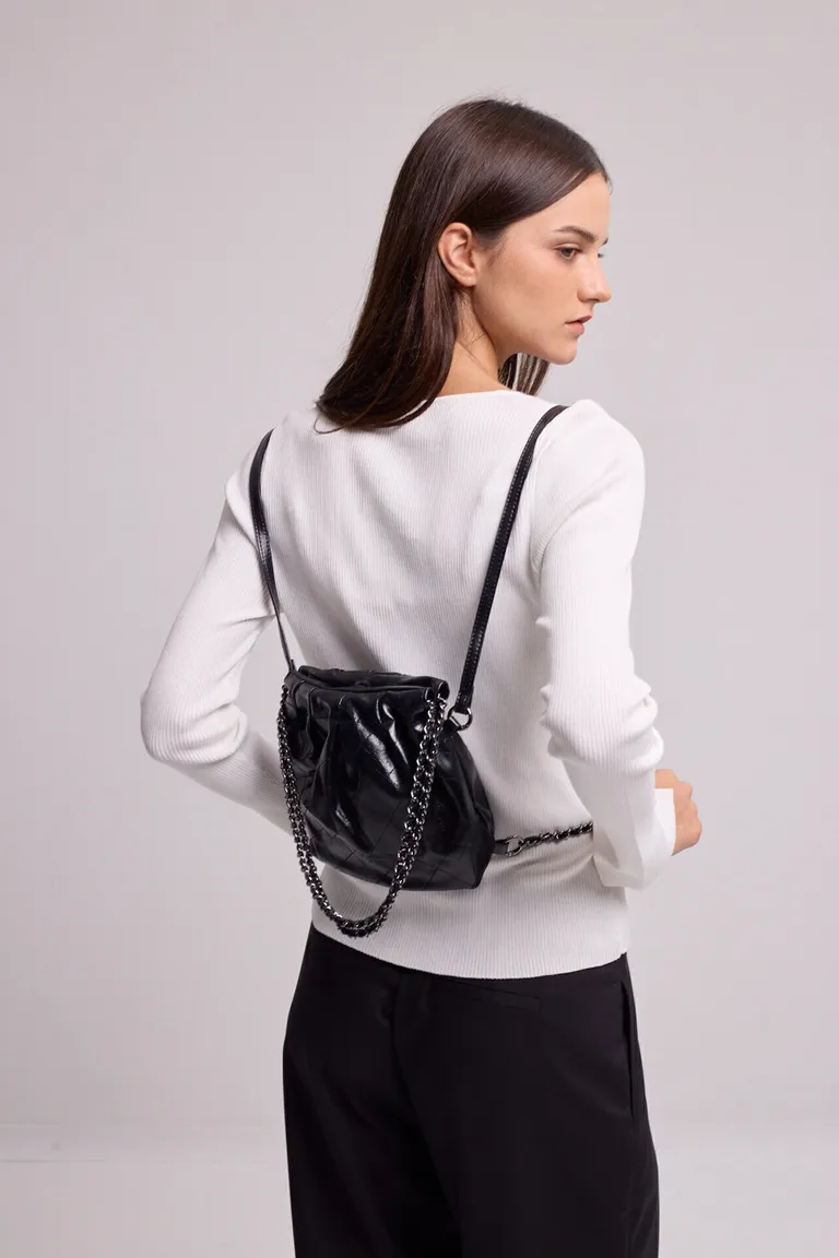 Mochila pequeña de estilo versátil con acabado brillante, diseñada para un uso cotidiano. Cuenta con correas de cadena que añaden un toque distintivo a su estructura, ideal para llevar tus pertenencias esenciales con comodidad. Este accesorio se adapta a diversos looks, combinando funcionalidad con un diseño moderno y compacto perfecto para completar cualquier conjunto.