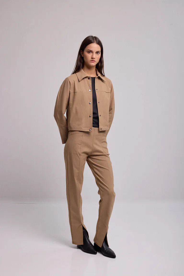Pantalon de estilo sastrero con silueta al cuerpo, destacandose por su diseño con recortes en el frente y tajos en la botamanga. Cuenta con bolsillos delanteros y cintura elastizada para un calce comodo y versatil en diversas ocasiones. Ideal para completar looks formales o casuales con un toque moderno y elegante.