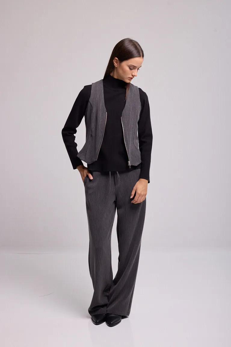 Pantalón de silueta recta y amplia, diseñado para brindar comodidad y estilo en el uso diario. Presenta una cintura con elástico y lazo ajustable, además de un cierre con cremallera y botón para mayor practicidad. Una prenda versátil ideal para combinar en diversos outfits.