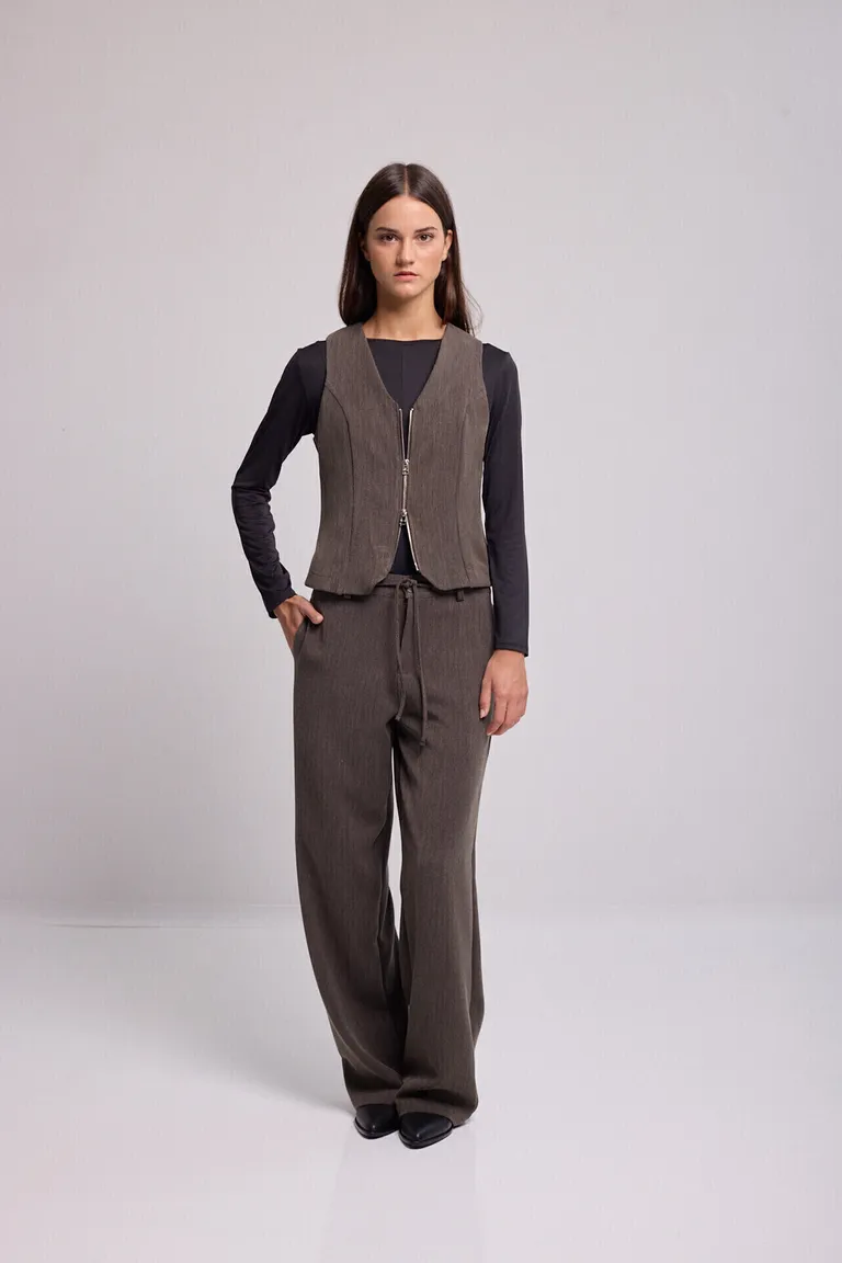Pantalón de silueta recta y amplia, diseñado con un corte cómodo que favorece la figura. Cuenta con un práctico cierre de cremallera y botón, sumado a una cintura elástica con lazo ajustable para mayor versatilidad. Una prenda ideal para armar equipos formales o casuales con estilo propio.
