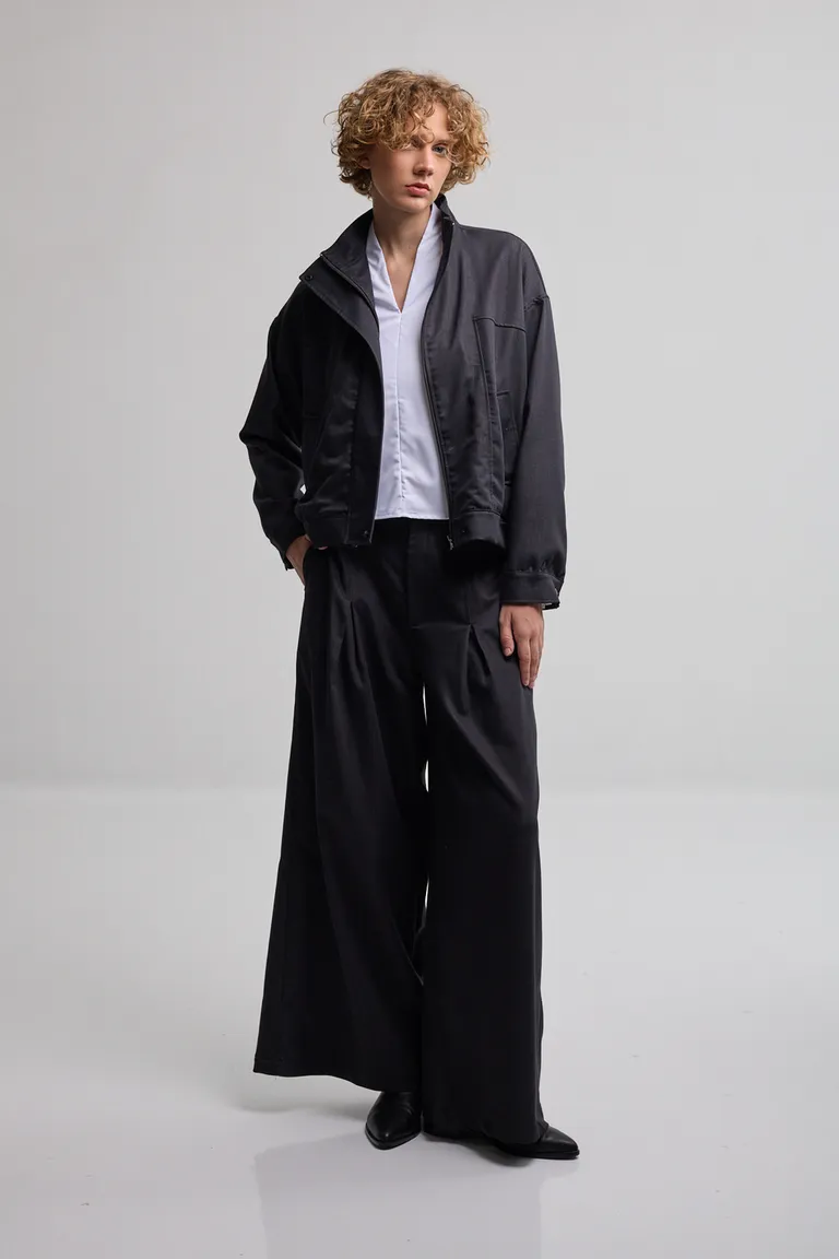 Pantalón de tiro alto con diseño de silueta ancha y fluida. Presenta un cierre con cremallera y detalle de tablas encontradas tanto en el frente como en la parte posterior, ofreciendo un estilo moderno y versátil para diversas ocasiones.