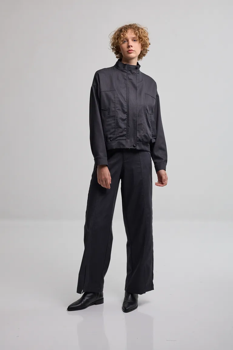 Pantalón tiro medio de corte recto y diseño funcional. Presenta recortes frontales, prácticos bolsillos laterales y una sutil abertura en el ruedo. Con cierre de cremallera y botón, incluye pinzas en la parte posterior para un mejor ajuste. Una pieza versátil y moderna, ideal para combinar en diferentes outfits urbanos manteniendo una línea limpia y sofisticada.