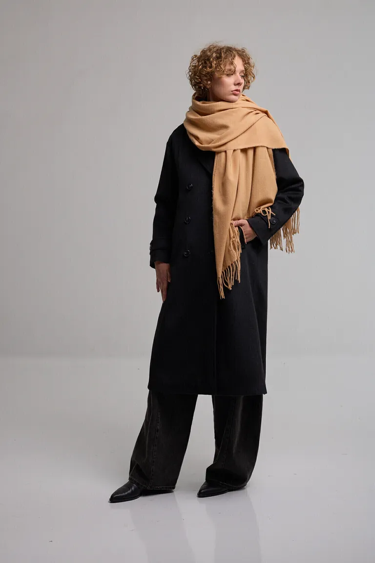 Pashmina de diseño envolvente con terminación de flecos en los extremos. Un accesorio versátil para complementar outfits de temporada, ideal para sumar calidez y estilo a cualquier conjunto diario.