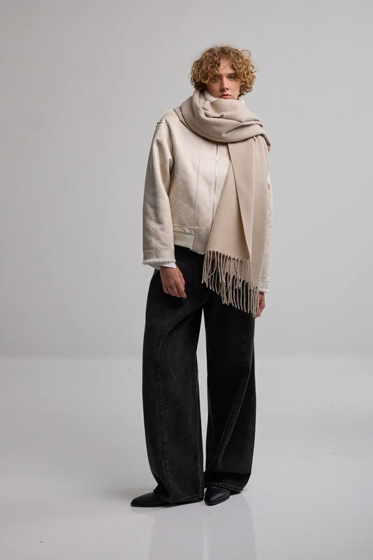 Pashmina de diseño envolvente con terminaciones en flecos. Un complemento versátil y atemporal ideal para sumar abrigo y estilo a tus equipos durante los días de baja temperatura. Fácil de combinar con diversas prendas de invierno.