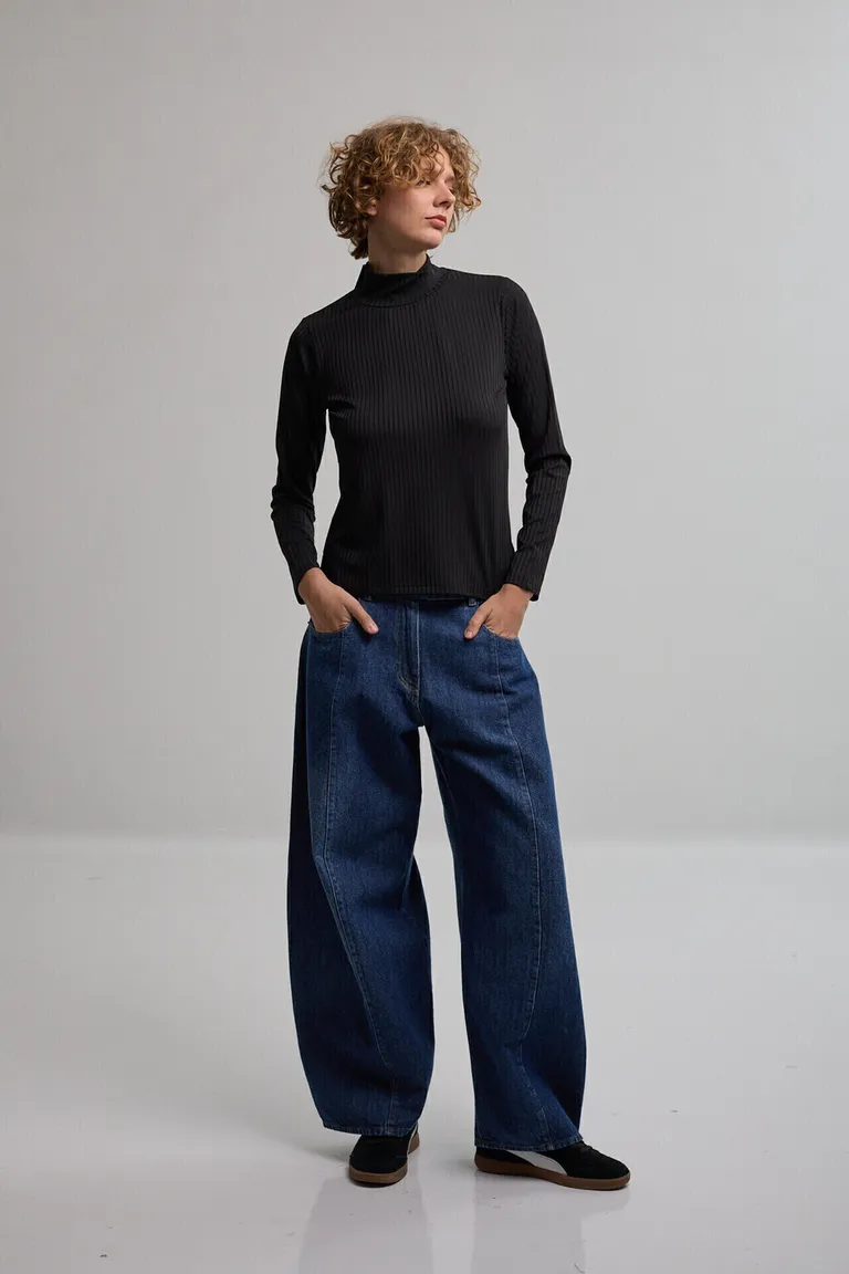 Remera de manga larga con cuello alto y textura acanalada, diseñada con una silueta ajustada al cuerpo. Ideal para combinar en looks casuales o formales, ofreciendo versatilidad y comodidad para el uso diario en toda temporada.