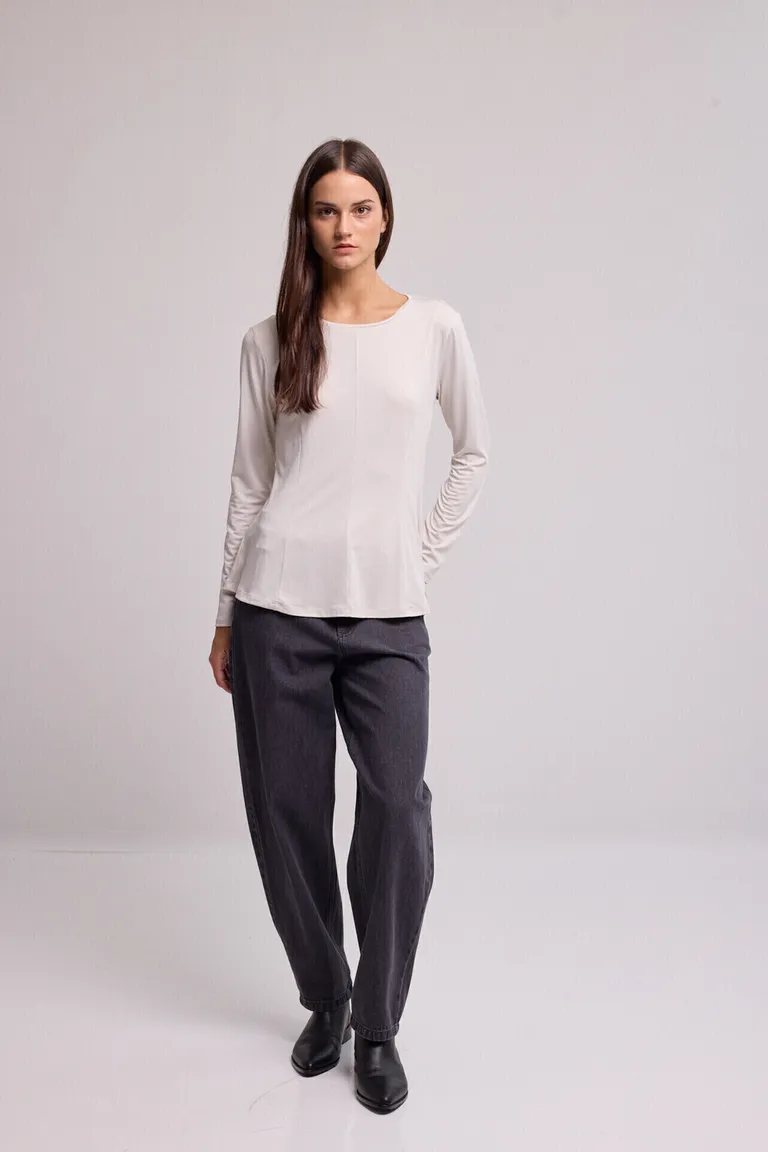Remera de manga larga con escote redondo, diseñada con recortes sutiles en la parte delantera y trasera. Una prenda versátil ideal para completar tus conjuntos diarios con comodidad y un calce que acompaña la silueta.