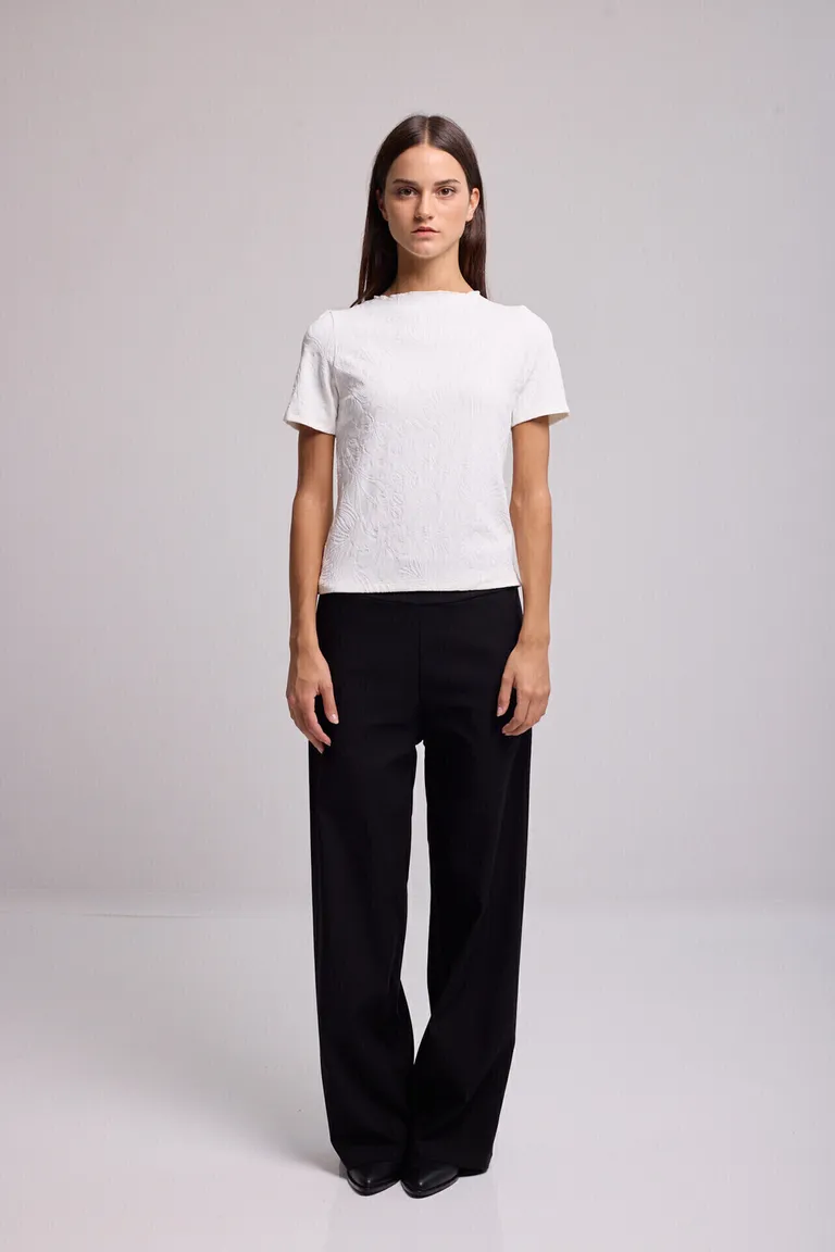 Remera de corte clásico con mangas cortas y detalle de delicada textura sobre la superficie. Presenta un acabado sutil en el contorno del cuello, ofreciendo una opción versátil y atemporal para combinar en diversos outfits diarios.