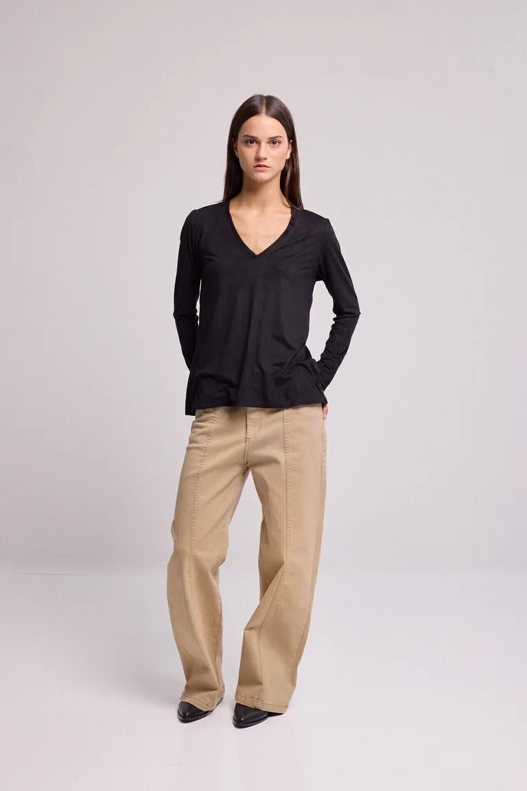 Remera de manga larga con elegante escote en v. Esta prenda de diseño básico es ideal para completar diversos conjuntos, ofreciendo versatilidad y comodidad para el uso diario. Presenta un calce relajado que se adapta a diferentes estilos, convirtiéndose en un ítem esencial para tu vestuario durante todo el año.
