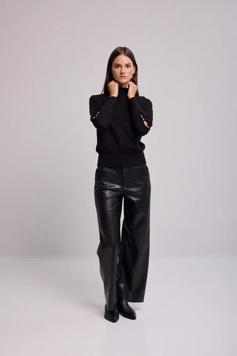 Sweater de tejido de punto con cuello alto y calce recto. Presenta diseño de manga larga con detalle de botones decorativos, junto a terminaciones en ribb en puños y cintura para un ajuste cómodo. Una prenda versátil ideal para completar conjuntos urbanos con estilo y sobriedad.