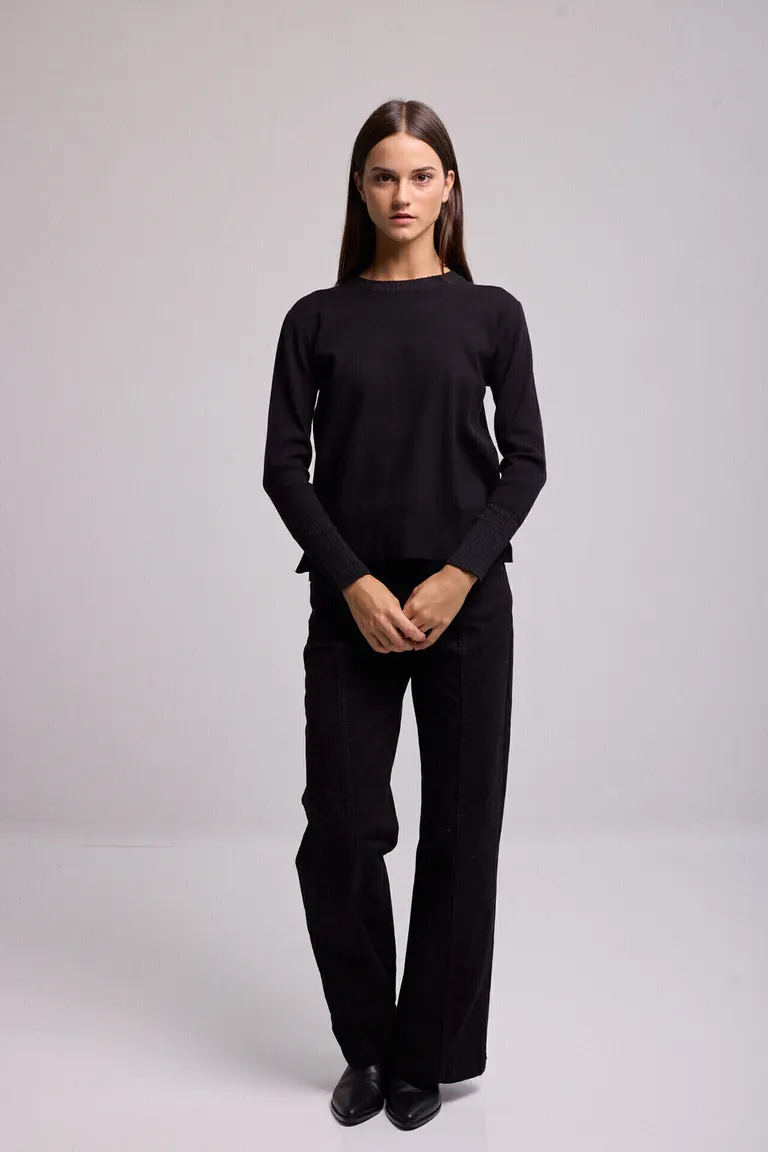 Sweater tejido con cuello redondo y calce recto. Presenta un diseño clásico con puños y cintura ajustados, incorporando detalles sutiles en lurex a tono y tajos laterales que aportan movimiento y estilo. Una prenda versátil ideal para completar tus looks diarios con elegancia y comodidad.