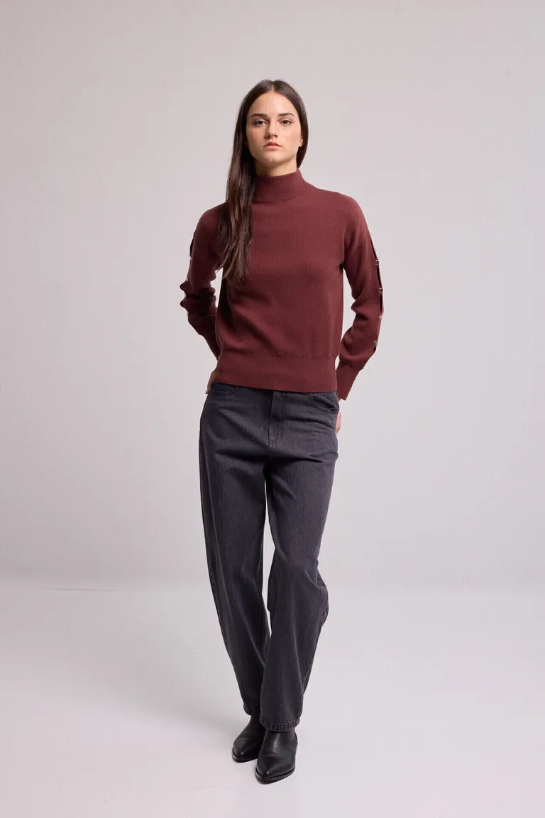 Sweater tejido de calce recto con cuello alto, mangas largas y detalle de botones decorativos en los puños. Diseño versátil y confortable, ideal para combinar en looks diarios con diferentes estilos. Prenda esencial de temporada con terminaciones en ribb en cintura y puños.