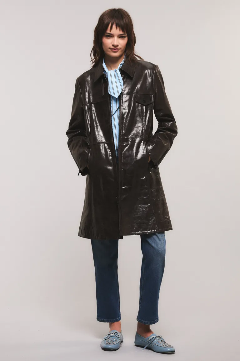 Abrigo de diseño clásico con terminación brillante y silueta estructurada, ideal para complementar diversos equipos urbanos. Presenta bolsillos con tapa y cierre frontal, ofreciendo una pieza versátil con caída fluida. Una opción sofisticada para renovar el guardarropa cotidiano con un estilo contemporáneo.
