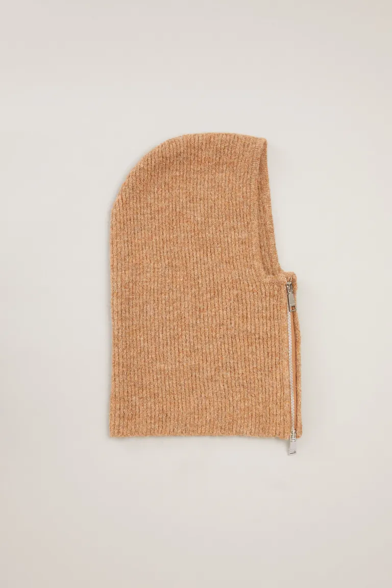 Balaclava tejida con cierre frontal metálico. Este accesorio proporciona calidez y cobertura, ideal para completar equipos en días fríos manteniendo un estilo funcional y minimalista.