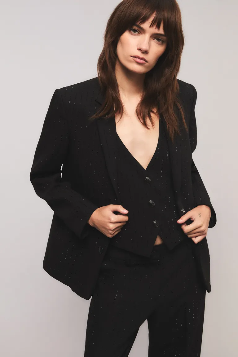 Blazer de calce regular con largo a la cadera, diseñado con detalles sutiles en la textura. Esta prenda presenta cierre frontal mediante broches y ofrece un estilo sastrero estructurado. Ideal para completar looks formales o elevar conjuntos diarios con un toque distinguido y versátil.
