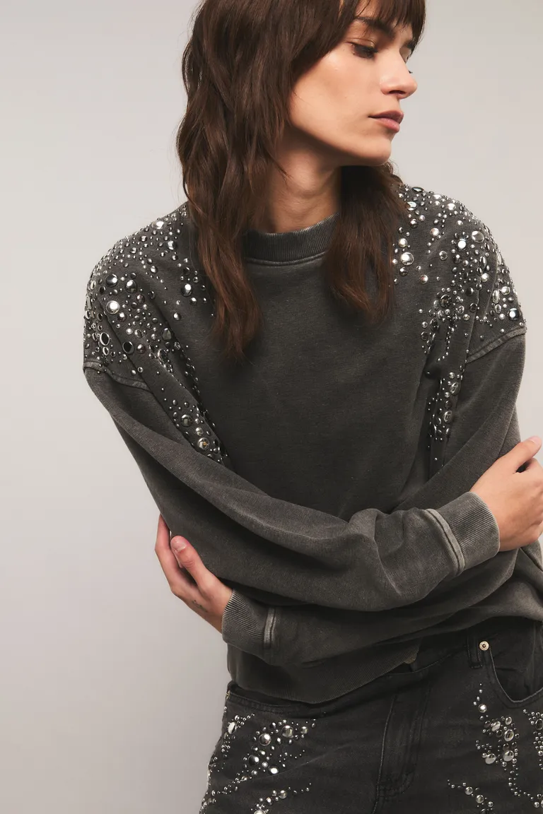 Buzo de calce regular con cuello redondo, diseño de mangas largas y detalle de tachas decorativas en la parte superior. Esta prenda presenta un estilo moderno y versátil, ideal para combinar en diversos outfits diarios gracias a su diseño cómodo y funcional con terminaciones en morley en puños y cintura.