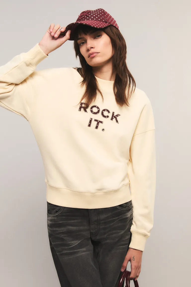 Buzo de calce regular con cuello redondo y mangas largas, diseñado con terminaciones en rib en puños y ruedo. Presenta un detalle de bordado con aplicación de tela en el frente. Una prenda versátil y cómoda ideal para completar looks urbanos cotidianos.