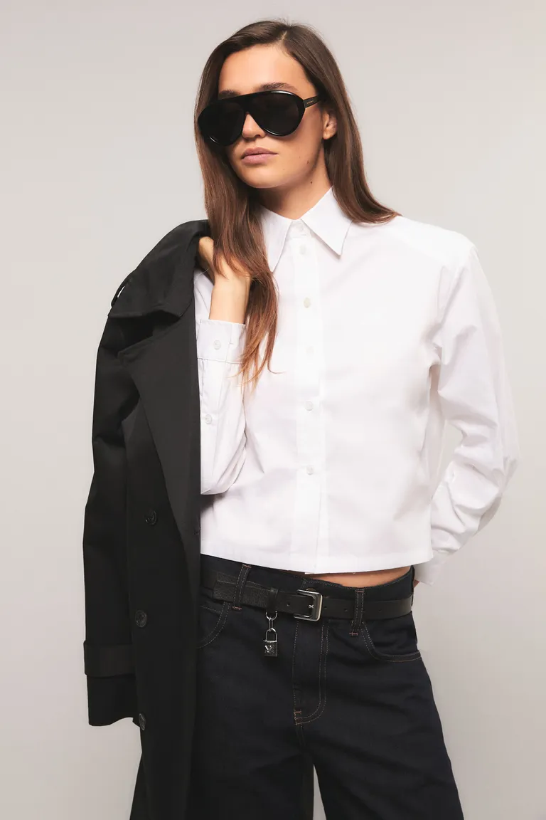 Camisa de corte regular con mangas largas y largo por encima de la cintura, diseñada con cuello clásico y detalles de pliegues en los puños. Esta prenda presenta una silueta versátil ideal para combinar en diversos conjuntos, ofreciendo una opción clásica y atemporal para el día a día.