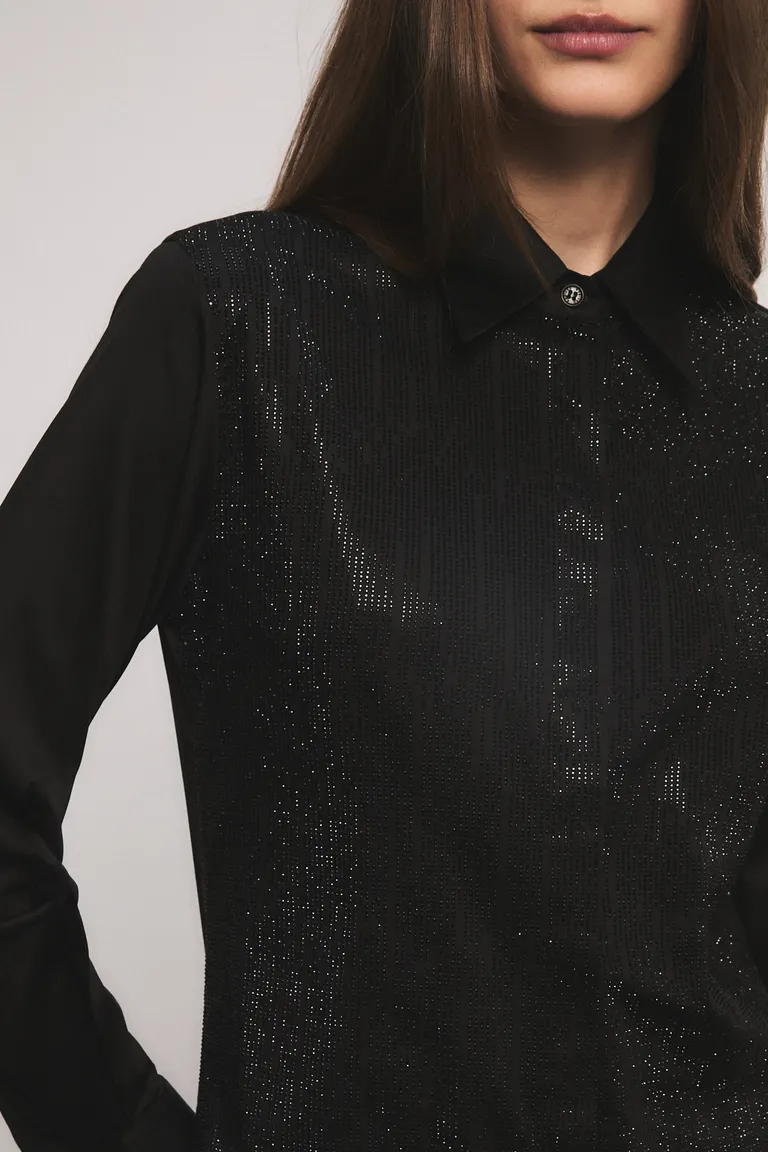 Camisa de corte entallado con cuello clásico y cierre de botones ocultos. Presenta un diseño distintivo con detalles de apliques brillantes integrados sobre la superficie, aportando textura y luminosidad a la prenda. Incluye pinzas de entalle en el frente y la espalda para una silueta definida, además de un detalle bordado personalizado en el puño. Una opción versátil y elegante para sumar distinción a cualquier equipo formal o casual.
