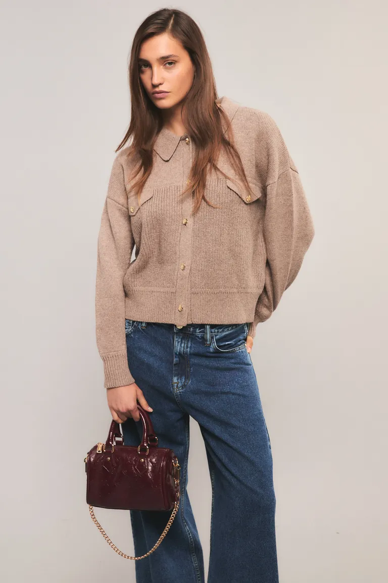 Campera tejida de calce relajado con mangas largas y cuello clásico. Incluye bolsillos decorativos frontales y cierre con botones personalizados. Una prenda versátil para el uso diario con un diseño distinguido por sus detalles constructivos y textura única.