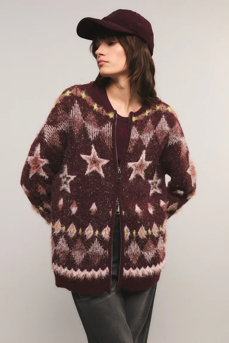 Cardigan de calce oversized con cierre delantero frontal y diseño de jacquard con figuras de estrellas y motivos geométricos. Prenda de diseño con terminaciones en rib, ideal para complementar outfits cotidianos con una capa superior versátil y cómoda.