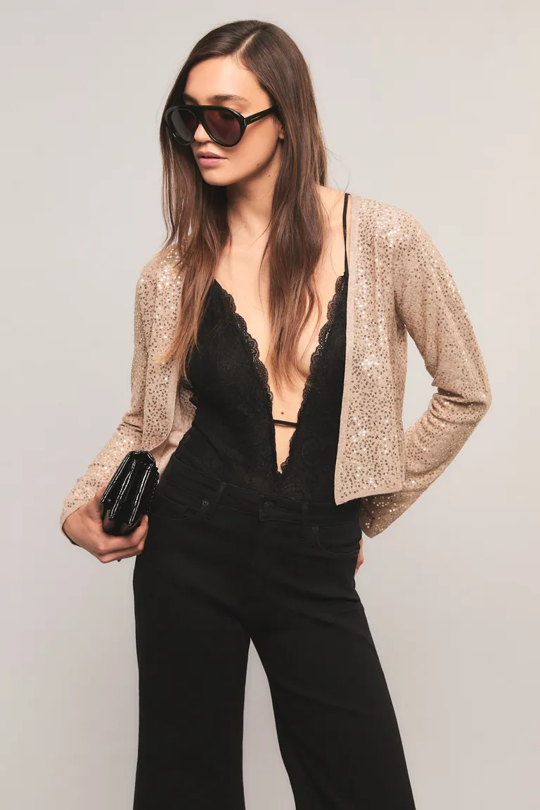 Cardigan de corte regular con detalle de bordado de lentejuelas en toda la superficie. Prenda versátil ideal para complementar diversos outfits, aportando un toque distintivo y elegante al vestuario femenino.