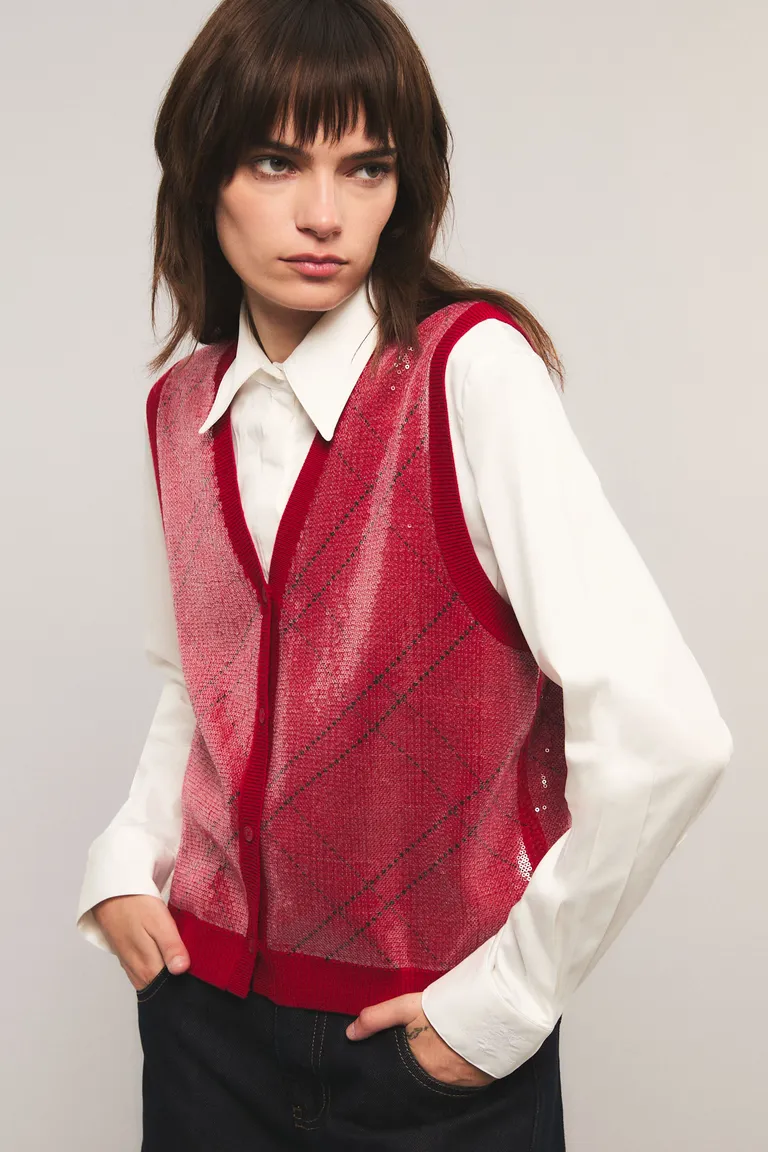 Chaleco con escote en V profundo y cierre frontal mediante botones. Esta prenda presenta una textura tejida con terminaciones en los bordes y detalle de lentejuelas en toda su superficie. Cuenta con un calce regular y es ideal para complementar looks en capas sobre camisas o prendas básicas.