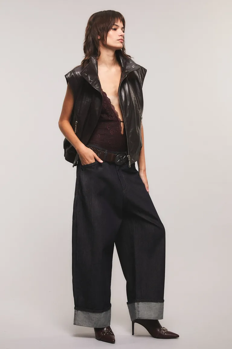 Chaleco de calce relajado con cuello alto, largo hasta la cadera, bolsillos delanteros con cierre y bolsillos ojal. Presenta cintura elastizada y cierre frontal con broches personalizados, ideal para completar un conjunto moderno y urbano.
