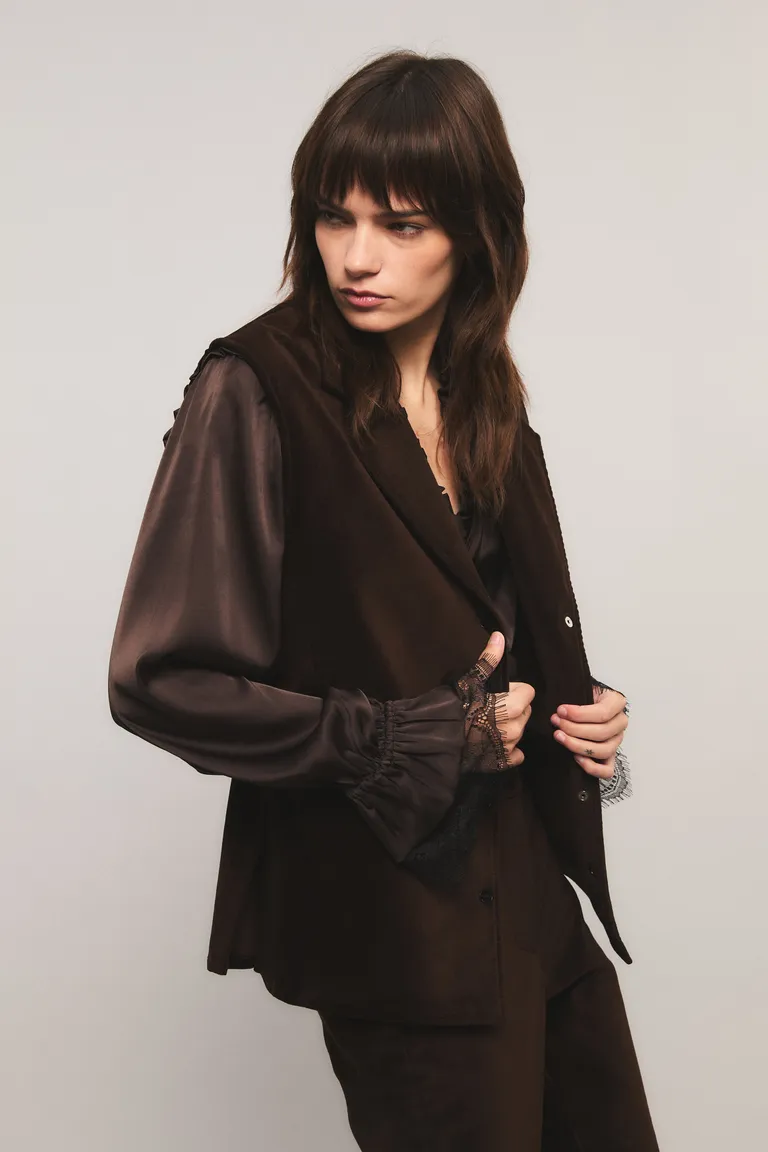 Explora este versátil chaleco de corte entallado que llega a la altura de la cadera. Presenta un clásico diseño con escote en V y prácticos bolsillos frontales, facilitando un cierre cómodo mediante broches metálicos. Ideal para elevar cualquier conjunto diario, esta prenda destaca por su diseño funcional y elegante, siendo un complemento esencial para diversos outfits urbanos.