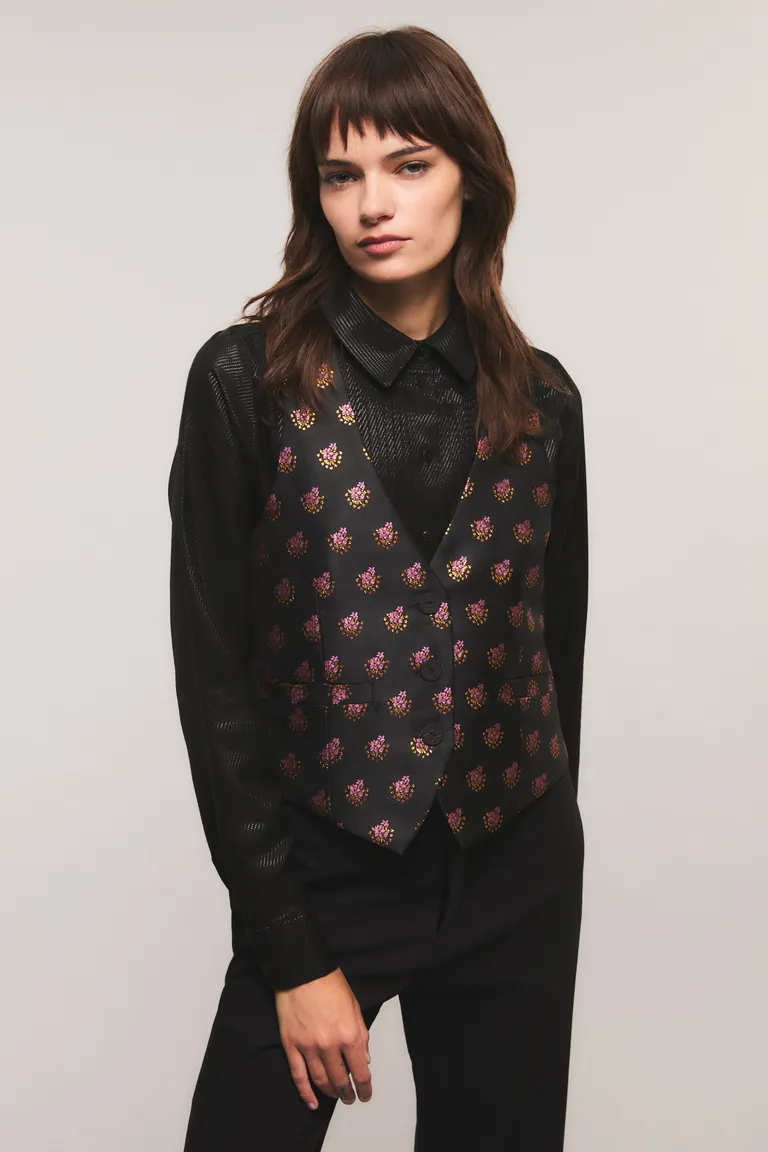 Chaleco sastrero con motivo floral en tejido estructurado. Presenta cierre frontal con botones, bolsillos ojal en el frente y detalle de correa regulable en la espalda para un ajuste personalizado. Una prenda versátil ideal para sumar estilo y elegancia a equipos formales o informales.
