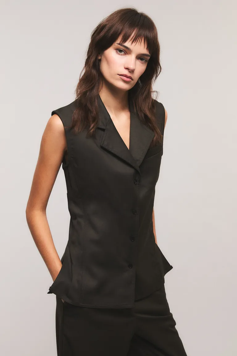 Chaleco de calce ajustado con diseño sastrero. Presenta cierre frontal, aberturas laterales y bolsillo aplicado con detalles de costuras. Una pieza versátil de línea entallada ideal para sumar estructura y formalidad a tus conjuntos de uso diario o eventos especiales.