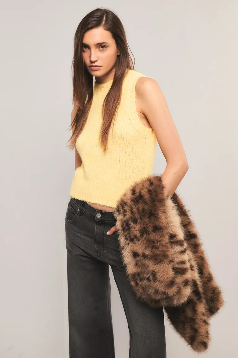 Chaleco sin mangas confeccionado en tejido de punto con terminaciones en rib. Presenta un acabado con efecto cepillado que le otorga una textura suave y un aspecto distintivo. Ideal para combinar en diferentes capas, esta prenda de calce regular ofrece versatilidad para diversos estilos urbanos. Una pieza clave para sumar textura a tus looks diarios.