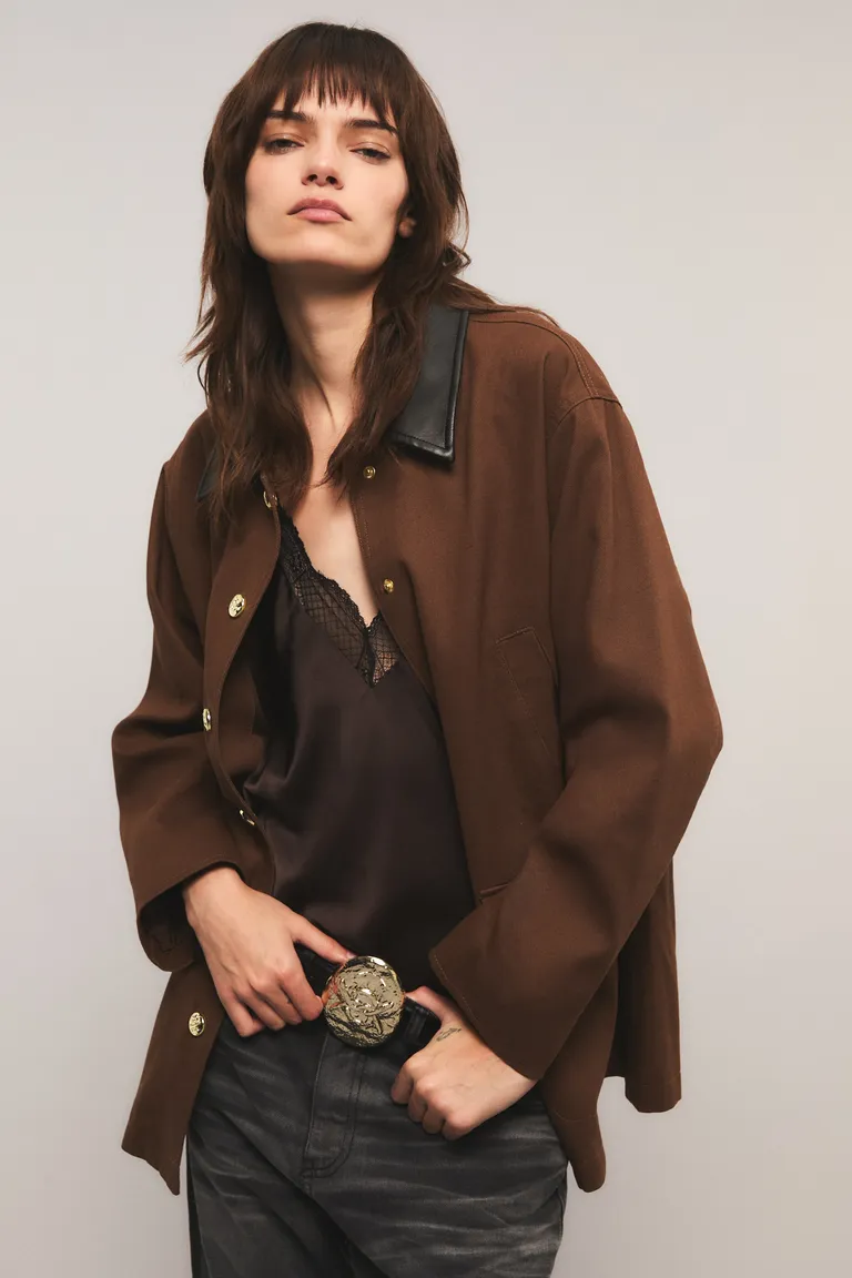 Chaqueta de corte recto y calce regular con largo por debajo de la cadera. Presenta diseño con cuello tipo camisero en material a contratono, cierre frontal con broches a presión y bolsillos integrados con y sin solapa. Un diseño funcional con detalles de pespuntes decorativos, ideal para completar equipos urbanos con un toque moderno y estructurado.