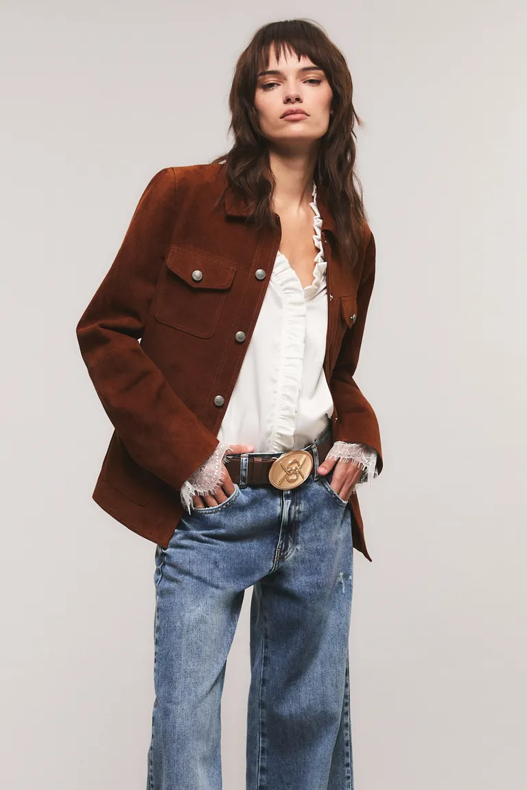 Chaqueta de corte clásico con diseño estructurado, bolsillos frontales con tapa y cierre de botones metálicos a presión. Presenta un largo hasta la cadera y un diseño con recortes definidos en el canesú que aporta una silueta definida. Ideal para combinar en diversos outfits, esta prenda es una pieza versátil que se adapta a distintos estilos, destacando por su calce regular y diseño funcional.