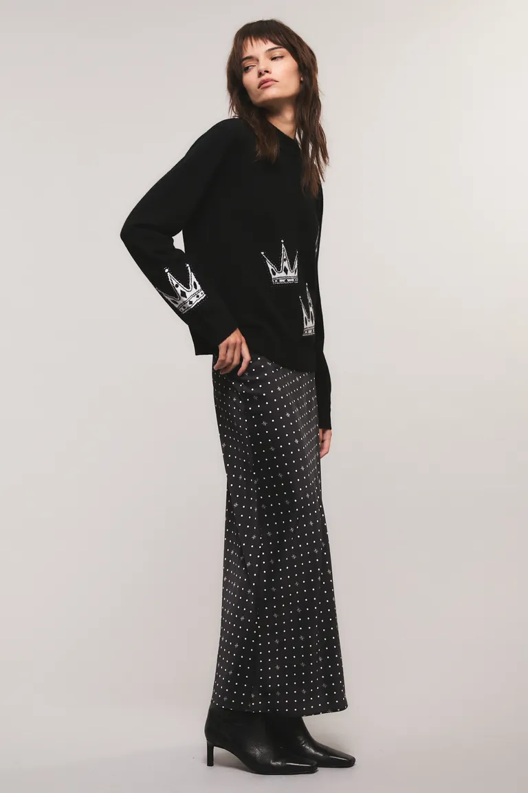 Falda midi con estampado de lunares, diseñada con corte al bies para una caída fluida y elegante. Cuenta con cintura elástica para mayor comodidad. Una prenda versátil, ideal para combinar en looks diarios o eventos formales, manteniendo un estilo clásico y distinguido.