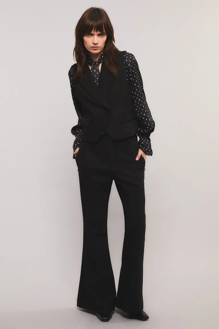 Pantalón de corte flare con diseño sastrero. Cuenta con bolsillos laterales de cierre invisible y bolsillos ojal en la parte trasera. Presenta cierre con broche personalizado y botón interno para un ajuste cómodo. Ideal para complementar looks formales o de oficina, ofreciendo una silueta estilizada y moderna que se adapta con versatilidad a diferentes ocasiones.