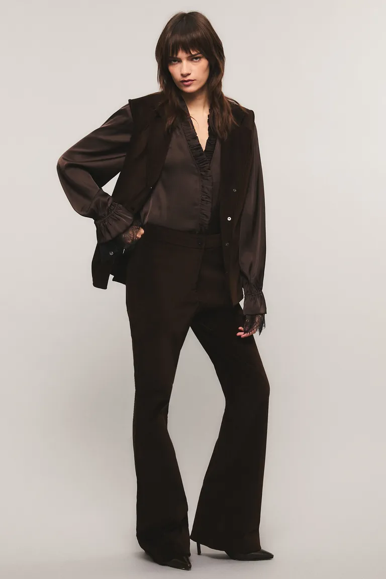 Pantalón de tiro alto con corte flare, diseñado con pinzas traseras y bolsillos decorativos en la parte posterior. Presenta un ajuste entallado que estiliza la figura y un cierre delantero mediante broche y cremallera, ideal para elevar cualquier conjunto formal o casual.