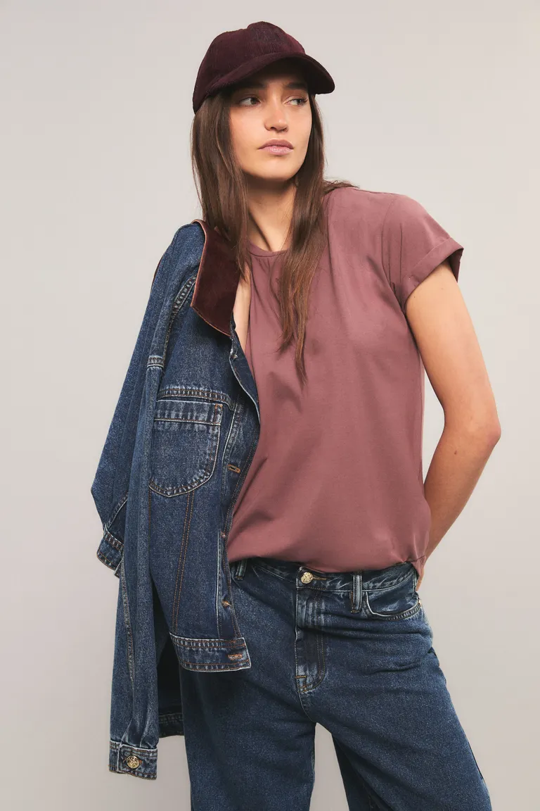 Remera de calce regular con diseño de cuello redondo y mangas cortas que presentan un sutil acabado arremangado. Esta prenda básica y versátil cuenta con un pequeño detalle bordado de la marca, ideal para combinar en looks diarios con un estilo relajado y cómodo.