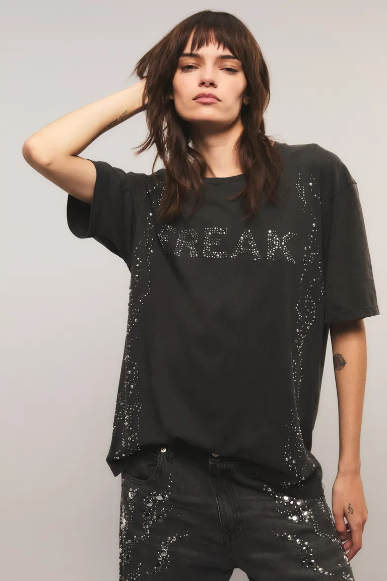 Remera de calce regular con cuello redondo y mangas cortas. Presenta un diseño distintivo con detalles de tachas aplicadas en el frente que aportan textura a la prenda. Con un largo hasta la cadera, es una opción versátil para completar conjuntos diarios con un toque moderno y urbano.