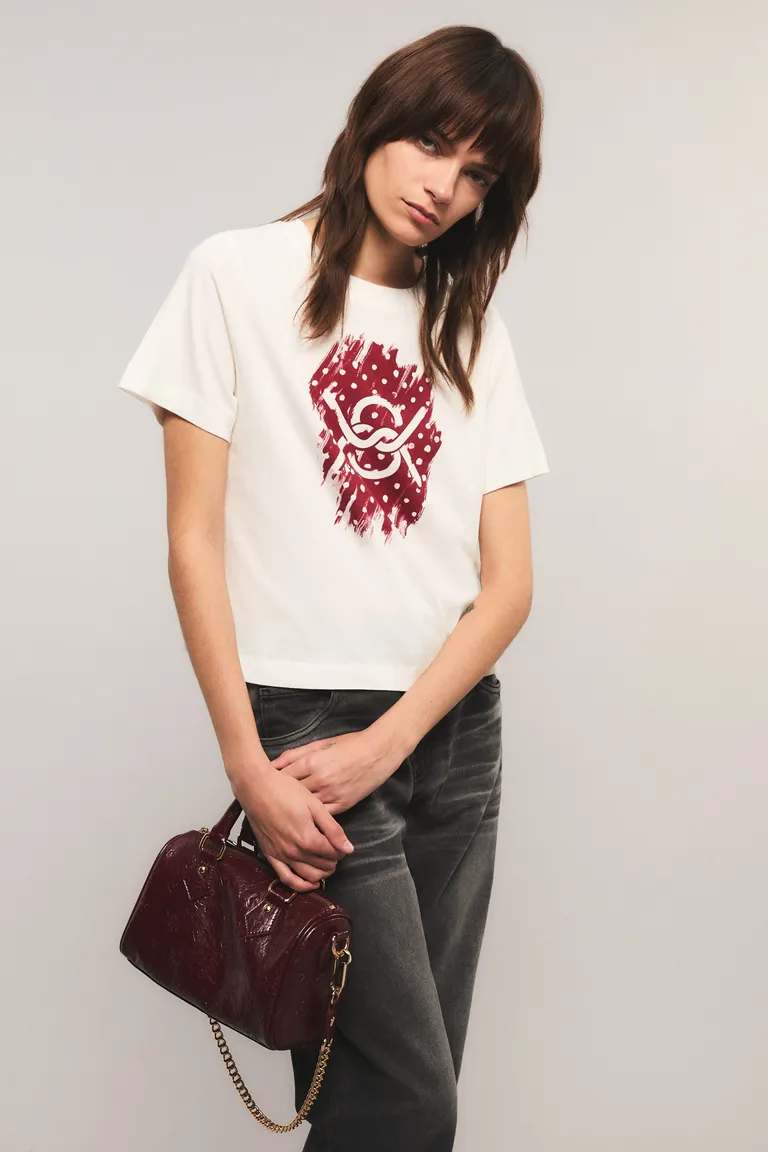 Remera de corte clásico con cuello redondo y mangas cortas. Presenta un diseño estampado central exclusivo. Su silueta de calce regular permite una caída natural a la cadera, ideal para combinar en looks casuales y cotidianos con diversas prendas inferiores.
