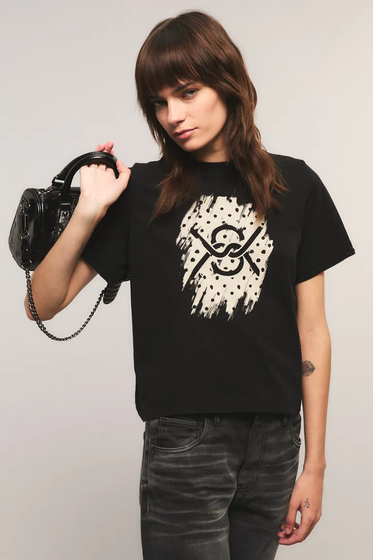 Remera de corte clásico con cuello redondo y mangas cortas. Presenta un diseño estampado exclusivo en el frente, ideal para complementar looks urbanos y modernos. De calce regular y caída cómoda, esta prenda básica se adapta fácilmente a diferentes estilos y ocasiones diarias.