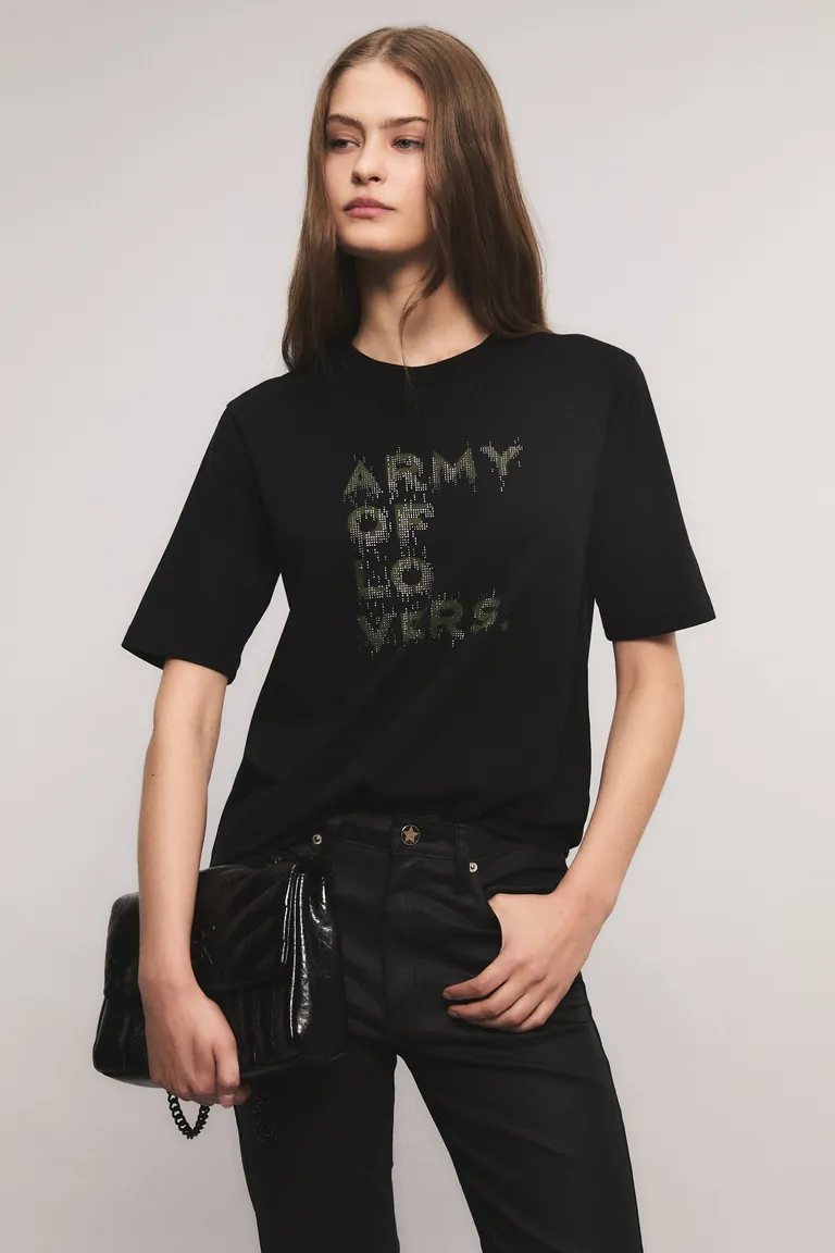 Remera de corte holgado con cuello redondo y mangas cortas. Presenta un detalle frontal con inscripciones destacadas mediante apliques, ideal para sumar un toque distintivo al guardarropa casual. Su diseño básico y funcional permite diversas combinaciones en looks urbanos y modernos para el uso diario.