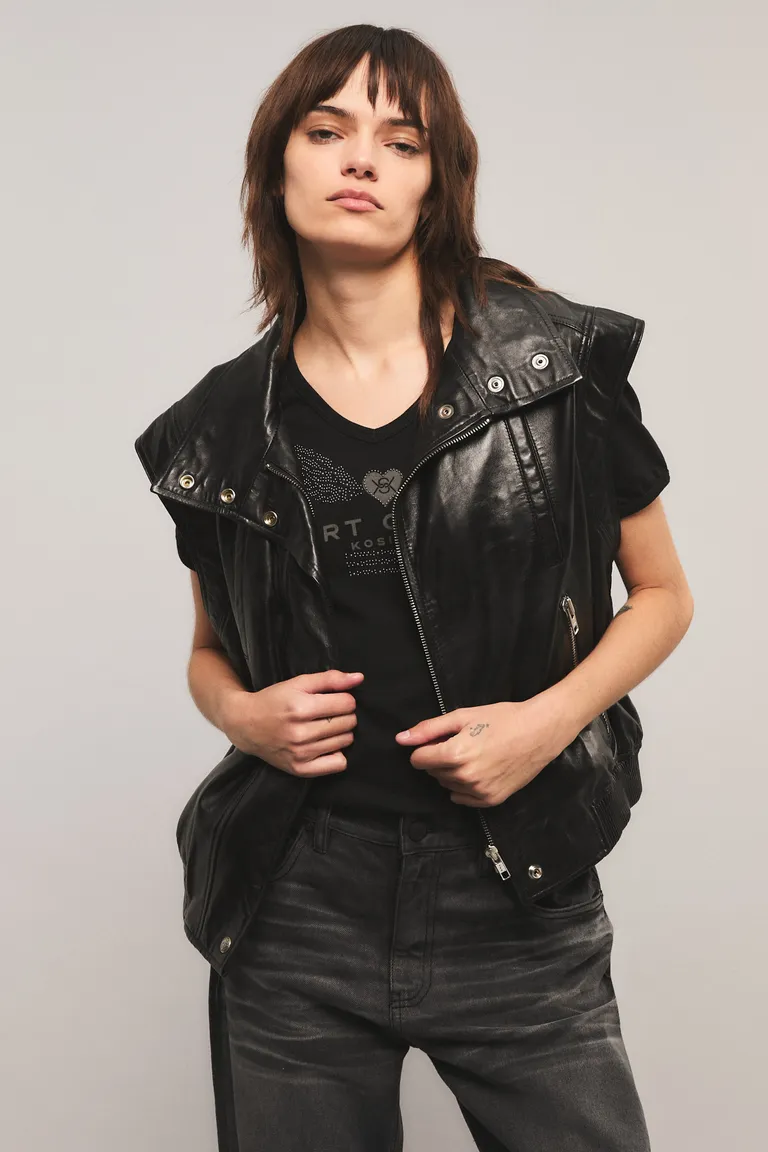 Remera manga corta con cuello en v estampa frontal y detalles de tachas aplicadas de Kosiuko