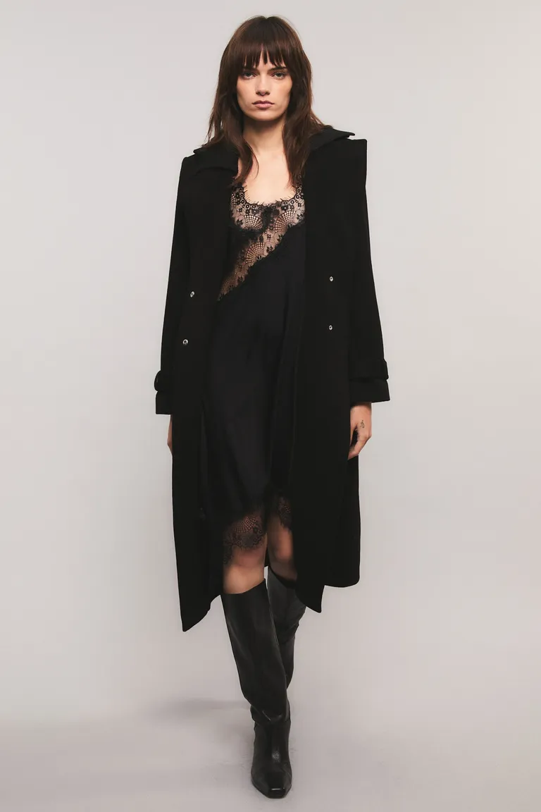 Tapado midi de silueta entallada con solapas sastreras y cierre frontal cruzado con broches. Este abrigo de largo medio presenta un diseño sofisticado con detalles funcionales en los laterales, ideal para completar equipos formales o urbanos en los días de bajas temperaturas.