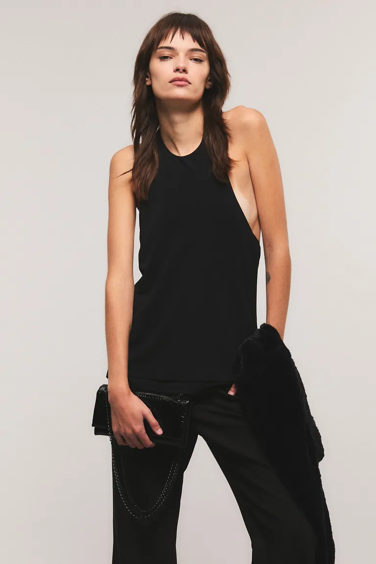 Top de corte halter con diseño de cuello alto y superposición que crea un detalle de doble corte. Su calce regular y largo hasta la primera cadera lo convierten en una opción versátil para diversos conjuntos. Ideal para quienes buscan una prenda elegante con un estilo sofisticado para el uso diario o eventos nocturnos.