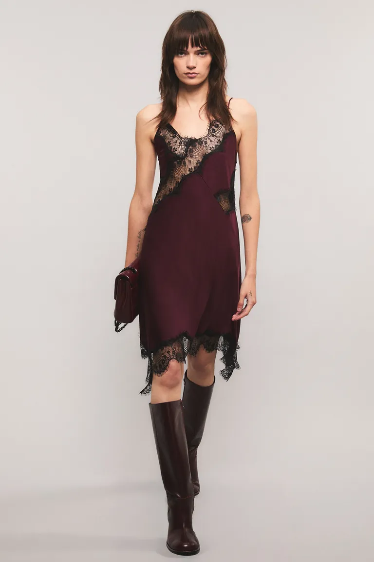 Vestido corto con corte al bies, escote en V y breteles regulables. Presenta un diseño asimétrico en el ruedo con detalles de puntilla estilo chantilly, ofreciendo un estilo elegante y fluido. Ideal para diversas ocasiones, este modelo aporta movimiento y sofisticación al look.