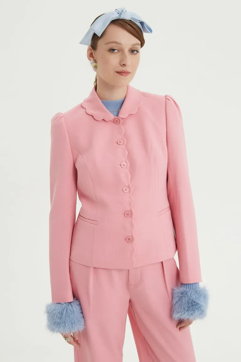 Blazer corto de corte sastrero con entalle en la cintura y cuello redondo. Presenta un diseño de terminaciones onduladas en el frente y hombros estructurados que aportan volumen. Incluye bolsillos ojal y cierre con botones frontales. Una prenda versátil ideal para integrar en conjuntos formales o elevar un estilo casual con un detalle distinguido.
